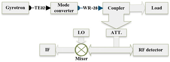The diagnostic setup is presented in Figure 4. The output of the gyrotron was coupled into an external mode converter, delivering a TE10 rectangular mode in a standard WR28 waveguide. Then, a calibrated coupler (−10 dB), power attenuators (fixed: −20 dB × 2, tunable: −14.7 dB) and splitter, detector (QuinStar, Torrance, CA, USA, QEA-FBFBAP), and mixer (Marki, Morgan Hill, CA, USA, MM10832H) were connected. The power was measured in the calibrated detector channel. The mixer was fed with L.O. (Avantek, Santa Clara, CA, USA, YIG tuned oscillator Y089-4056) and tuned to 35.2 GHz. This channel was used to verify the proper frequency in each operation, rejecting any result with a frequency content indicating parasitic mode interference. Thus, only measurements with the single desired mode of forward interaction in the cavity were considered.