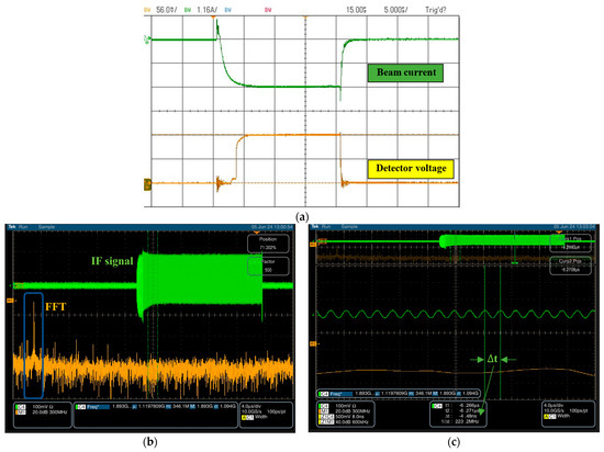 Measured signal and spectral content of a pulse with a single mode. (a) Typical ~20 µs pulse beam current (green, 1.16 A/div) and detector voltage (yellow, 56 mV/div). (b) IF signal from the mixer (green, 100 mV/div) and spectral content FFT (orange, 300 MHz/div) of the IF signal with single-mode TE02 (~223 MHz), clear peak is seen, marked in a blue box. (c) Zoom to one period of the IF signal, showing a single mode with a ~4.48 ns period pointed with the green arrow (IF: ~223 MHz).