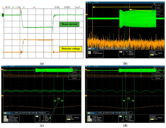 Measured signal and spectral content of a pulse with two modes. (a) Typical ~20 µs pulse beam current (green, 1.16 A/div) and detector voltage (yellow, 58 mV/div). (b) IF signal from the mixer (green, 100 mV/div) and spectral content FFT (orange, 300 MHz/div) of the IF signal with two modes: TE02 (~203 MHz) and TE22 (~1.64 GHz). (c) Zoom to TE02 signal period marked in green arrow of 4.91 ns (IF: ~203 MHz). (d) Zoom to TE22 signal period marked in green arrow of 608 ps (IF: ~1.64 GHz).