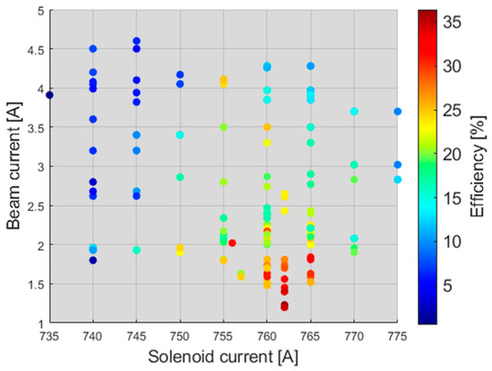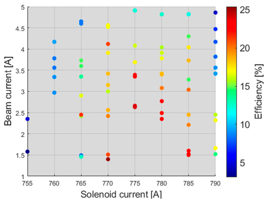Most efficient working points: (a) the electron efficiency for the curves and (b) solenoid current and beam current at the optimal efficiency working points.
