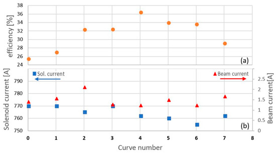Similar graphs were made for all the curves. The most efficient working points were taken out from each graph and are summarized in Figure 9. As can be seen, the highest efficiency was measured in curve #4 as 36.4%. This is related to the 25.4% efficiency measured at the fundamental curve #0 representing zero gradient. Figure 9b presents the beam current and the solenoid current at the optimal points of each curve.