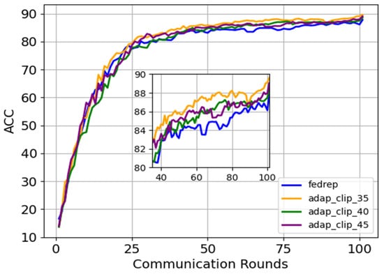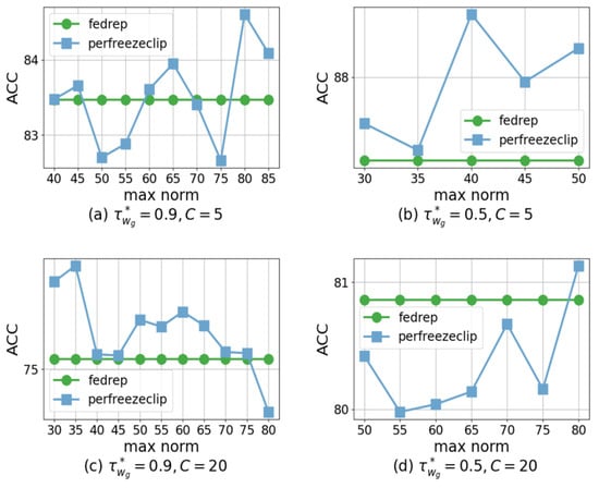In Figure 5a, setting the maximum value of norms to 35 yields the highest performance for PerFreezeClip. Afterward, the accuracy decreases accordingly. Subsequently, Figure 5b–d demonstrate fluctuations in the final test accuracy of PerFreezeClip. Nonetheless, the best value of among various maximum norm thresholds can still be selected. Across a–d in Figure 5, PerFreezeClip consistently outperforms FedRep when the maximum value of norms is set to 35, 55, 55, and 50, respectively. This emphasizes the significance of selecting optimal thresholds for peak performance.
