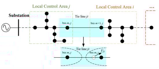 Considering the impact of LCAi’s neighboring LCAs on LCAi, we defined the power flows in the tie line between LCAi and LCAj as Pij and Qij. The index of the LCA closest to the feeder head in the LCAi’s neighboring LCAs was defined as i − 1. Then, the impact of the LCAi’s neighboring LCAs on the voltages within LCAi can be expressed as: