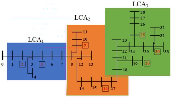 To achieve distributed control, the distribution network was divided into N L LCAs by aggregating the high electrical contact buses, which is shown in Figure 1. Then, the linearized DistFlow in LCAi can be expressed as: