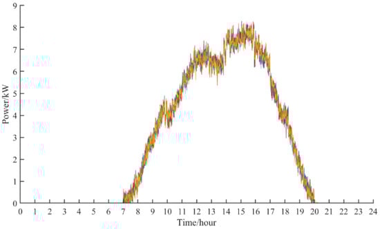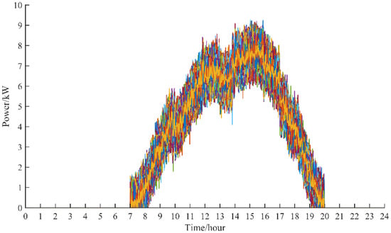 In this paper, taking into account that PV generation is generally zero from 0 to 7 a.m. and 8 to 12 p.m., there was no need to consider any prediction errors. Based on the PV prediction error model given by (4), the initial scenarios of PV generation are depicted in Figure 5.
