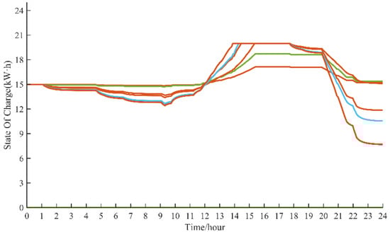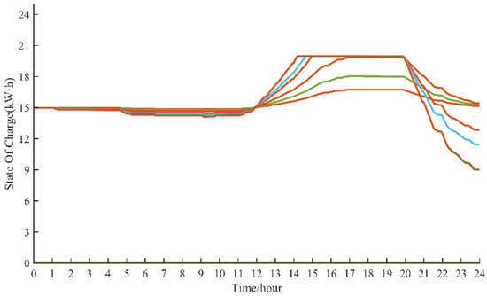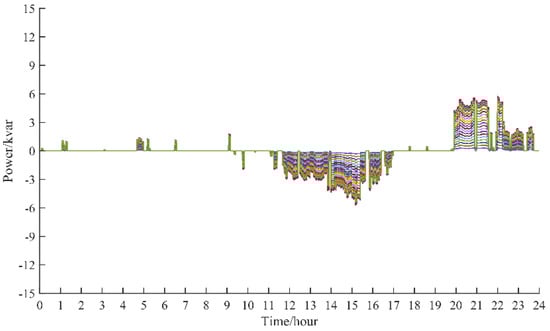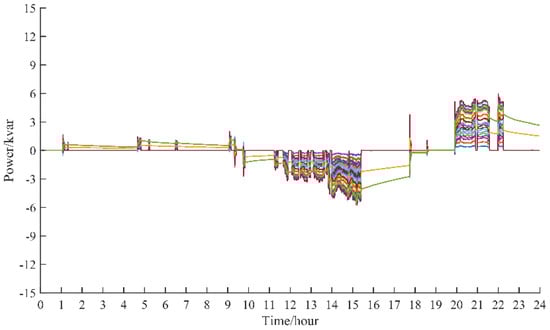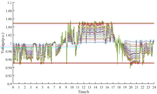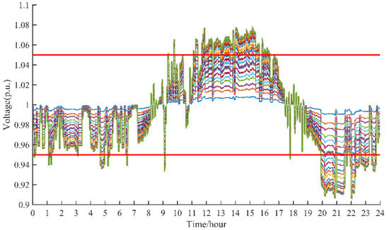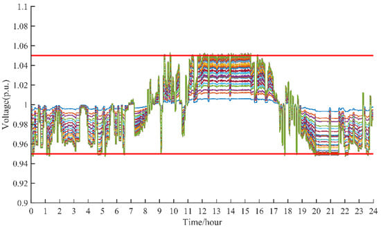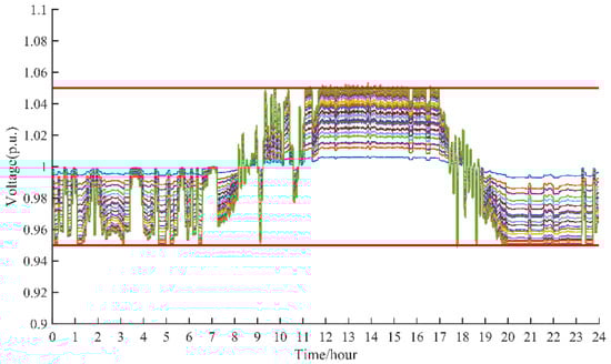 In the absence of any control actions, the voltage profile of all buses in the test system is shown in Figure 7. It can be seen from Figure 7 that the voltage violations in the system were quite serious. Then, the DSMPC method proposed in this paper was implemented to coordinate the control of PV inverters and BESSs. Figure 8 shows the voltage profile of all buses with the proposed control method. As shown in Figure 8, it is evident that the system voltage was effectively regulated and returned to its normal operating range in the majority of cases. There were only a few instances where the regulatory effects were less than ideal, which could be attributed to an overly relaxed selection of operation scenarios, resulting in a significant deviation from real-world conditions. Figure 9 and Figure 10 show the normalized state of charge for all BESSs and control actions for all PV inverters with the proposed control approach, respectively.