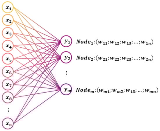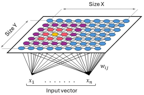 Thus, the NN has weighted connections between the nodes of successive layers just like a classical NN; however, the substantial difference between the two is that the SOM neurons have no activation function. During training, the SOM adjusts its weights to represent the input data optimally. This process occurs through the iterative presentation of input data to the network. In fact, during each iteration, the SOM selects the neuron with the closest weights to the input data, which therefore represents the winning neuron, also called the Best Matching Unit (BMU) [