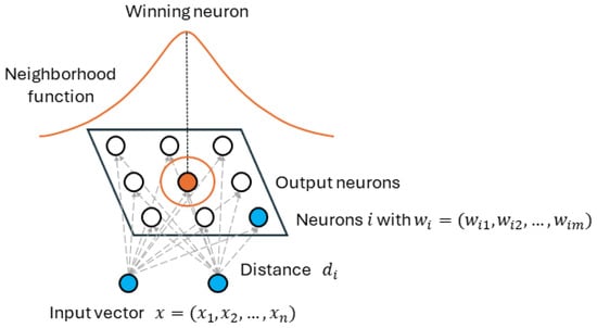 37], for that iteration. Then, through a process known as neighborhood adaptation, the SOM adjusts the weights of the neurons surrounding the winning neuron so that the neurons close to the winner become more similar to the input data [