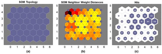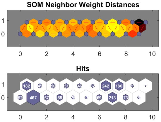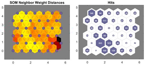 36]. The resulting map can be used to visualize and analyze data more efficiently because each point on the SOM representation is assigned a color that depends on the weight vectors associated with the neurons and represents the relative position of the neurons on the map based on their distance. Neighboring neurons on the map have similar colors, while distant neurons have different colors.