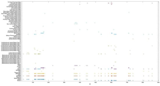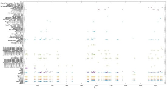 In specific clusters, the efficiency was notably lower. For example, cluster 11 included artifacts from all technological categories, and clusters 35 and 36 encompassed all typological categories. Lastly, clusters 13, 18, 25, 29, and 33 exhibited only a few groupings based on artifacts, indicating the algorithm’s inability to determine proper clusters (clusters 13 and 33,