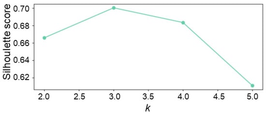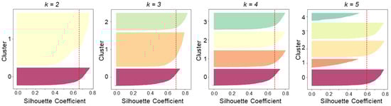 As can be seen, for k = 5, the silhouette values of some clusters are lower than the total mean value, indicating that the instances in those clusters are too close to the other clusters, and therefore, the clustering of the data is not good. In other cases, however, the instances exceed the mean value and may represent good choices. However, for k = 2 and k = 3, some clusters are very large (with an index of 1 in both cases), while for k = 4, all clusters have similar sizes. Therefore, although the total silhouette score for k = 3 is higher than that obtained for k = 4 (see