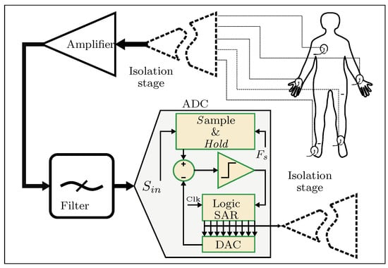 According to the ADC evolution and the recent surveys [5], the SAR class achieves a mean resolution of 10 bits (see Table 1). For biomedical signals, the frequency range is in low bandwidth, and the Successive Approximation Register (SAR) ADC presents a good balance for these applications in terms of energy and resolution [6]. The increase in chronic diseases such as diabetes and heart disease steers the creation of devices for monitoring and processing biomedical signals for healthcare applications. These devices need resolutions larger than 10-bit which are possible with several improvements in the SAR ADC, including the SAR logic. Figure 1 shows the general block diagram of a SAR ADC in a biomedical signal conditioning circuit. The basic working principle in the SAR architecture is constructing the digital word and comparing the input signal at different weights of a reference voltage. For every bit conversion, the circuit samples and holds () the input signal. Following the S&H, there is an analog summing point. It is calculated by the difference between the input signal () and a digital-to-analog converter (DAC) feedback output, obtaining the quantization error in the analog domain. Subsequently, the comparator returns a logical value (1 or 0) depending on the error. A logic register maintains this value, which, depending on the received information, sends a control signal to the DAC.
