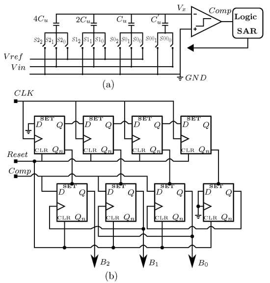 Figure 3 illustrates the digital control logic of a 3-bit single-ended ADC SAR proposed in [15]. The circuit, depicted in Figure 2b, uses a shift register at the top, transferring the HIGH logic state from the first flip-flop to the last in cascade mode. The flip-flops Q outputs serially set “1” during one clock cycle, while the corresponding triggers the lower circuit named the “code register”. This code register updates the corresponding flip-flop according to the resulting comparator bit and control signal for the analog switches. At the end of each conversion cycle, the value in the code register represents the digitally converted word (, and ). Figure 2a shows the signal switch control, including switching signals for the corresponding voltage to the bottom plate capacitors (e.g., ), including the sample and hold stages. The circuit in Figure 2 is a typical choice for its simplicity and ease of understanding in SAR ADCs with 5–10 bits of resolution. Some analog designers prefer the full custom design of the digital blocks to implement the SAR logic control. Increasing the ADC resolution spec (more than 10-bit) constrains the SAR logic digital components and increases interconnections. Moreover, if the designer projects a fully differential structure with a bipolar input signal, the implementation and time for designing the logic SAR can significantly increase due to the non-linear workflow.