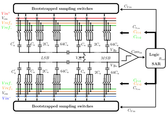 A fully differential circuit offers benefits by canceling the common mode noise, including the fully differential comparator. The differential SAR uses two matrices of split capacitances per input terminal with the corresponding differential logic Successive Approximation Register (SAR). For this implementation the voltage references are: V, V, V suggested for a CMOS UMC 180 . The following subsections detail the design considerations in this ADC SAR implementation.