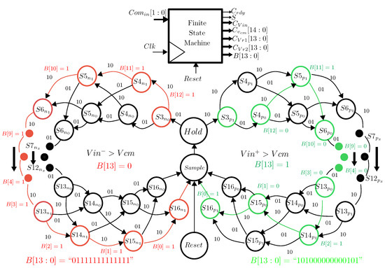 When the output is ‘1’ and for the output is ‘0’. There are two points to notice in the successive approximation: (i) in the left side of the FSM diagram in Figure 5, the control bus disconnects the capacitors from and connect to reference voltage according to Figure 4, i.e., when the bit is ‘1’, the next state returns the to 1 while returning if . Both signals maintain the previous state if . And ii) On the other hand, on the right side of the FSM for , the control signal states are at and and for signals will be the opposite value. This configuration fulfills the expressions (7) and (8) for , and (9) and (10) for , where and represent the comparator inputs.