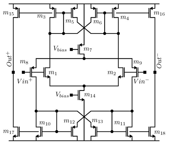 The proposed comparator in Figure 7 uses a complementary structure of n-type and p-type differential pairs. It adopts the continuous-time and positive feedback high-gain comparator in [19]. The basic circuit function is a latch amplifier with hysteresis. The latch-amplifier phase depends on the factor in the differential gain as , where . With , the comparator latches the output voltages as . The symmetrical feature renders the proposed comparator robust to Process Voltage and Temperature disturbances. The complementary differential pairs mirror the outputs with , , and and the differential gain is: