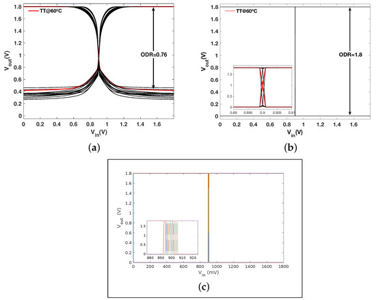 Comparator DC sweep response comparison. (a) PT variations performed to the comparator in [19]. (b) PT variations with the proposed comparator, including zoomed view. (c) Monte Carlo analysis of the proposed comparator, including zoomed view.