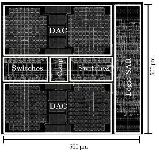 The proposed 14 bit SAR ADC design uses the Finite State Machine as a novel logic SAR, the robust comparator, and switches configuration of this work in a UMC180nm CMOS technology. The layout fits in 0.25 mm2 (500 μm × 500 μm). The layout in Figure 9 considers a symmetrical disposition with a common centroid for the capacitive DAC array. The SAR ADC layout incorporates dummy structures for the capacitive network, with the comparator at the center alongside dummy transistors.