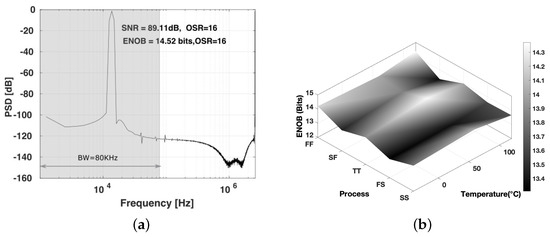 The post-layout simulation for a 80 bandwidth and Oversampling Rate (OSR = 16) exhibits the spectrum in Figure 10a. The sampling frequency for this test is 2.56MS/s with a 13.760 kHz sinusoidal input signal, which is below the bandwidth limit to observe possible harmonic content. The post layout result yields bit of ENoB considering the Typical-Typical statistical models from the UMC180nm process design kit at 60 °C.