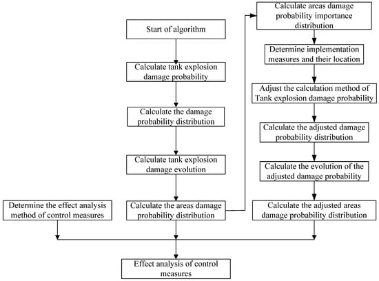 (2) The utility analysis method for controlling storage tank explosion accidents is introduced. By analyzing the area damage probability importance distribution, the locations where the probability distribution locations are identified. Blast walls are chosen as control measures based on blast wave characteristics. Following the implementation of these measures, the calculation method for area damage probability is adjusted, and the area damage probability distribution is recalculated. A comparison is made between the original and modified area damage probability distribution, using the control measures. The algorithm flow is provided, allowing smart cities to compare different accident control schemes and select the most suitable measures intelligently.