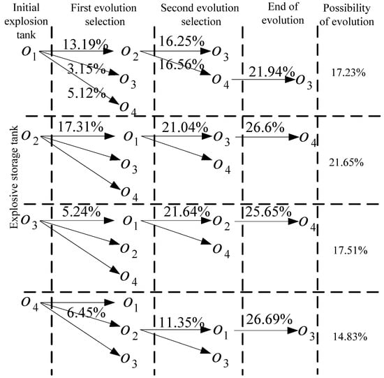 Set tank 1 as the detonation tank. , is the probability of damage caused by to ., , , and . The second comparison (evolution) process is , , among , . , , . , , . The maximum damage probability sequence of the storage tank when the storage tank detonates is , while the corresponding damage probability is . The process of analyzing the remaining tanks as initial explosion tanks is the same. The damage evolution process of the four storage tanks as initial explosion tanks is shown in Figure 2.