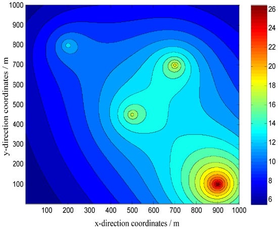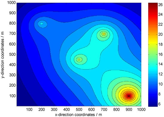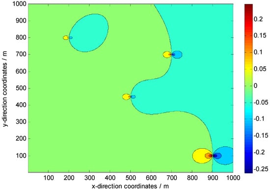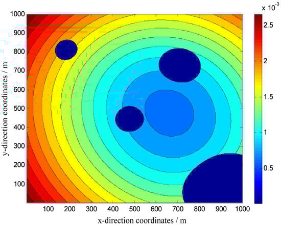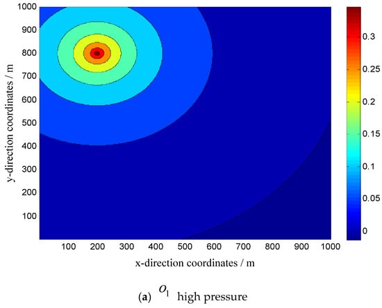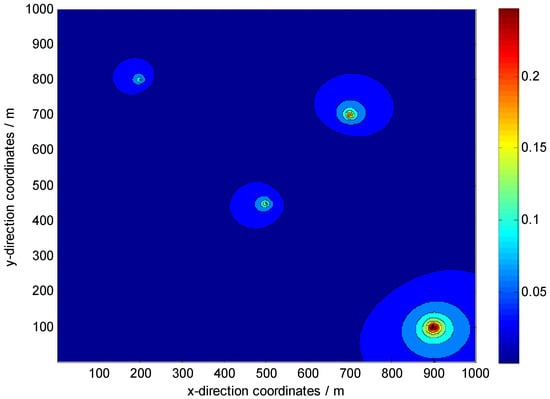 In Equation (10), represents the reduction in damage probability at the position after the implementation of control measures. Here, without taking measures is generally greater than after taking measures in all locations of the park. is a matrix, where each positioning element has a value of . The larger is, the better the effect of protective (blast walls) measures are at the position. Of course, there are many methods to analyze the effectiveness of control measures. Generally, different algorithms are designed according to different purposes, and the above method is just one of them.