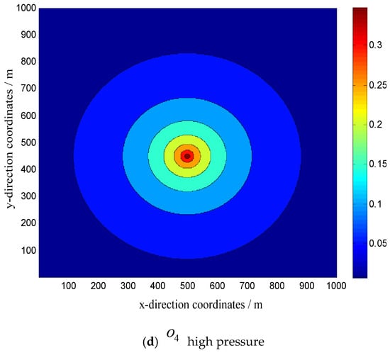 In Figure 5 and Figure 6, the damage probability importance distribution in a single direction has little change, and the gray dividing line of different colors only divides the whole area into two parts. It also shows that the area damage probability distribution does not change much in most areas, and it only changes greatly at the gray boundary of different colors. By considering the storage tank’s location, it becomes apparent that the gray dividing line in the figure connects the boundaries of the primary affected areas resulting from the storage tank explosion. Moreover, the distribution areas and dividing lines of damage probability importance vary across different directions. This variation is a result of the algorithm design and also reflects the evolving process characteristics of a storage tank explosion.