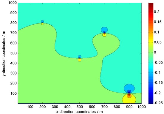 Contour lines are utilized to represent the importance value in the figure. The contour lines for the storage tank position are densely packed, indicating intense explosion effects in these areas, making them unsuitable for blast wall installation. Consequently, blast walls are positioned where the damage probability importance changes first: at the outermost explosion site of the chemical industrial parks and the storage tank explosion site. The blast walls are arranged in an arc centered on the storage tank and can withstand shock waves with an overpressure of 10 KPa. By referring to Equations (8) and (9) in Section 5.2, the area damage probability is recalculated post-implementation, as depicted in Figure 1 and Figure 8. Figure 8 closely resembles Figure 4, illustrating the area damage probability distribution after the measures are in place, which is calculated according to the evolution process of the storage tank explosion damage under the most unfavorable conditions shown in Figure 4. The area damage probability distributions within the blast walls remain constant due to the algorithm settings. Otherwise, Equations (8) and (9) are employed to compute the area damage probability distribution. However, distinguishing differences in the area damage probability map is challenging, hindering the demonstration of blast walls’ control effectiveness. Therefore, the method proposed in Section 5.2 for analyzing the effectiveness of control measures is utilized to describe the accident control effectiveness of the measures. By utilizing Equation (10), along with Figure 4 and Figure 8, the effectiveness of the measures’ implementation is assessed, and Figure 9 is generated to display the distribution of damage probability reduction following the implementation of the measures.