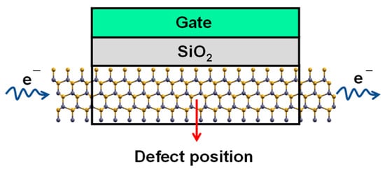 In order to investigate the impacts of the Al ion implantation-induced defects on 4H-SiC MOSFET channel transport behaviors, a local 10 nm channel region containing defects was considered (local channel), as shown in Figure 1. Since point defects like the C vacancies and C interstitials in 4H-SiC are highly localized, showing an extension of less than 1 nm [], a 10 nm channel region containing these point defects is enough to study their local electrical behaviors. The oxide and gate thicknesses are 1 nm and 0.5 nm. To reduce the influence of the gate metal type, the work function of the gate was assumed to be equal to the perfect 4H-SiC crystal. The quantum transport problem was solved by the iterations between Schrodinger’s equation in the NEGF form and Poisson’s equation using the NanoTCAD ViDES code []. The gate voltages (Vg) ranging from 0–6 V were applied, and the drain-to-source voltage (Vd) was set to 0.3 V. The convergence criterion for the equation solution is that the magnitude of the difference in the grid potential vector between adjacent iterations is less than 0.01 V.