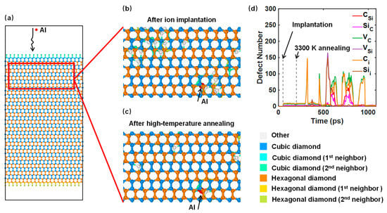 Schematic illustration of the MD simulations on the Al ion implantation and post-annealing processes. (a) 4H-SiC Newton layer before implantation. (b,c) 4H-SiC crystal structures after the implantation and annealing. (d) Statistic defect numbers during the two processes.