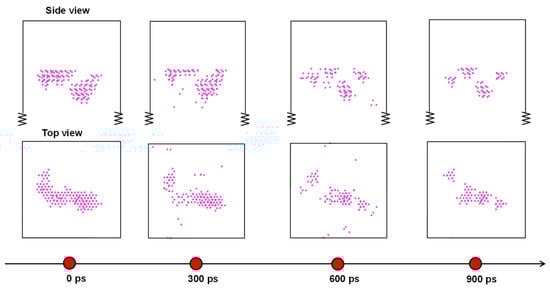 In order to explore the defect evolution, we extracted the damaged lattice atoms (pink) identified by the IDS method in Figure 3 at the moments just after implantation (0 ps), annealing (300 ps and 600 ps), and after annealing (900 ps). At 0 ps, it had the largest number of damaged lattice atoms and damaged area, in which the damaged atoms gather along the implantation trajectory of the Al ion. Then, they experienced a self-repairing stage during the annealing (300 ps and 600 ps images), resulting in the continuously reduced damaged area. Finally, the damaged area and the number of damaged lattice atoms became the smallest after 900 ps annealing, which proves that a 3300 K high temperature is appropriate to repair the implantation damage.