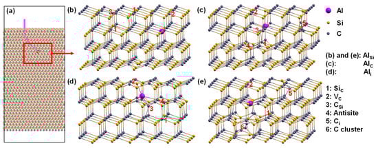 At the atomic scale level, Hornos et al. carried out early density functional theory (DFT) calculations on 4H-SiC supercells and found some stable and metastable Al ion-related complex defects [], but their originations and stabilities are questionable due to the lacking of molecular dynamics (MD) simulations. Wu et al. studied the defect evolution and doping efficiency of Al ion implantation in 3C-SiC using the MD method, and they found surface recrystallizations that were closely related to compressive stresses []. Their defect descriptions stayed at the atom cluster level, leading to indistinguishable defect details, let alone their couplings with Al ions.
