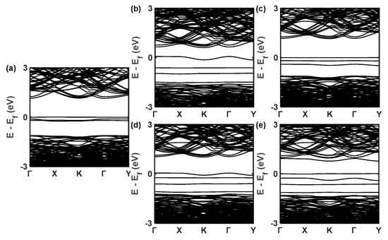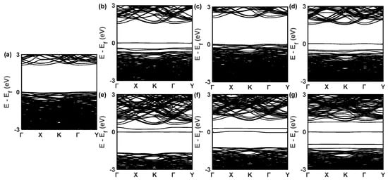 The DFT calculations using the Perdew–Burke–Ernzerhof (PBE) function are realized by the QUANTUM ESPRESSO software []. The ultrasoft pseudopotential (USPP) is selected for Si, and projector augmented wave (PAW) pseudopotentials are applied to C and Al. To facilitate the subsequent transport calculations, we used a 3 × 5 × 1 supercell containing 240 atoms to calculate the defect effects, which is derived from a 16-atom rectangular unit cell. During the crystal force optimization process, the supercell variations are allowed until the force on each atom is smaller than 1 × 10−3 Ry/bohr []. The energy cutoff of 30 Ry is used in the band structure calculations along the Γ − X − K − Γ − Y high symmetry direction [,].
