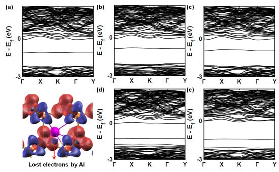 When Al becomes an interstitial atom, the system exhibits distinct n-type doping characteristics, which is defined as the self-compensation effect by the previous literature []. From the real space deformation charge densities in Figure 8a below, the electron contribution to the system by the Ali is clearly observed. The delocalized electrons are injected into the CB and become free carriers. The presence of SiC, CSi, and Ci defects will not significantly affect the system characteristics, as shown in Figure 8b,c,e. However, when there is an antisite around Ali, as shown in Figure 8d, a trap state will be generated near the VB, and the free electrons injected into the SiC system by Ali will be captured, consequently restraining the n-type doping characteristics of the system.