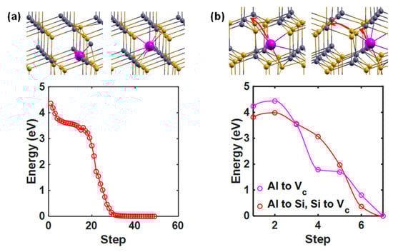 However, the single Ali will also introduce a deep level and even lead to a serious n-type doping phenomenon. Therefore, we continued to study its couplings with other defects. It was found that when an Ali meets a VC near it, as shown in Figure 9b, it will occupy the vacancy in two almost barrier-free ways. The first one is that the Ali directly migrates to the VC, resulting in an AlC and encountering an energy barrier of 0.2 eV. The second path is that the Al replaces the Si, and the Si migrates to the VC, resulting in an AlSi–SiC coupling and encountering an energy barrier of 0.17 eV. Both results will compensate for the n-type doping effect induced by Ali, which is beneficial to the p-type doping purpose.