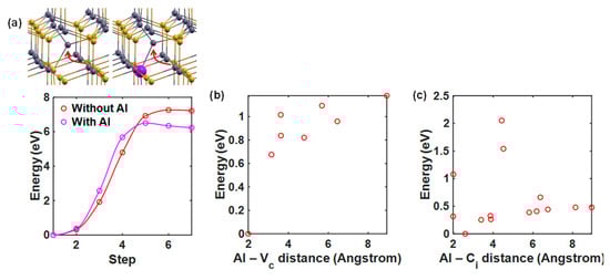 Probabilities of AlSi doping inducing or attracting additional points defects. (a) Energy variations to generate a VC–Ci pair due to the movements of C atoms denoted by the red arrows, with or without an AlSi. (b,c) Energy variations along the AlSi–VC and AlSi–Ci distances.