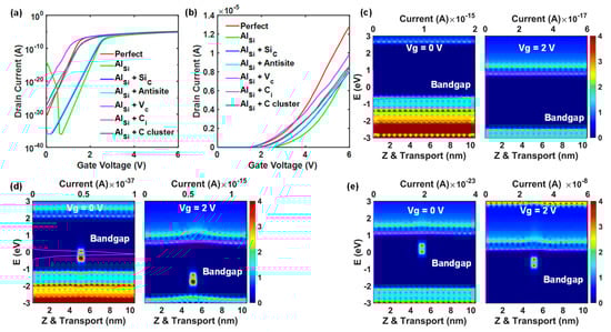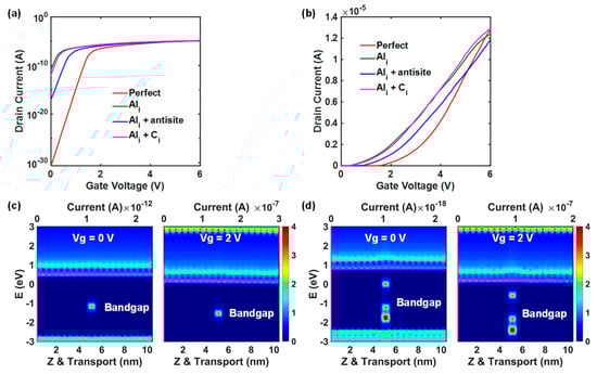 The transfer characteristics of the 4H-SiC MOSFETs with only AlSi are shown as green lines in Figure 11a,b. Compared with the perfect channel without any defect and Al ion, the local p-type doping effect is clearly observed at the AlSi channel since the carriers are mainly holes at Vg = 0 V. Along the increasing Vg, the hole current is reduced rapidly, and then the electron current dominates the transport. To further verify the transport mechanism, the channel density-of-states (DOS) (background color) and current spectrum (pink lines with peaks along the x-axis) of the AlSi channel were calculated and shown in Figure 11c,e. The bright DOS regions represent the VB and CB, while the blue dark regions are bandgaps. Since the 0.3 V Vd is applied by setting the Fermi levels of the source and drain regions to ±0.15 eV, the DOS, located at the ±0.15 eV transport window, will obtain high probabilities to contribute currents. At Vg = 0 V, the VB DOS are closer to the transport window, and a hole current peak is clearly observed, which not only verifies the hole current phenomenon but also shows that the p-type doping has moved up the VB of the local 10 nm channel to become a p-type region. At Vg = 2 V, both the CB and VB are moved down, and the CB DOSs are closer to the transport window, resulting in the majority of carriers changing from holes to electrons.