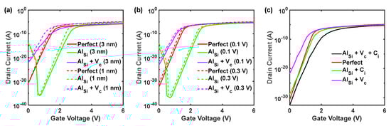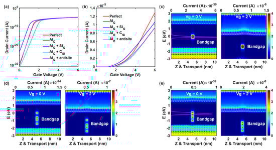 Figure 13a,b show the transfer characteristics of the 4H-SiC MOSFET local channels in the presence of AlC and are coupled with other defects. From Figure 7, AlC does not contribute to the doping effect, but it induces three mid-gap trap states. These states seriously impede the carrier transport, as the subthreshold swings (SS) of the AlC and AlC + CSi channels are obviously enlarged compared with the perfect channel. These phenomena can also be well explained in Figure 13c, as these trap states induce a non-negligible electron barrier at Vg = 2 V.