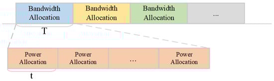 The VHTS communication system in this paper adopts a double-timescale management strategy of bandwidth and power to flexibly meet the real-time traffic demands while maintaining the resource utilization and system stability. The management strategy consists of a large-timescale bandwidth and power allocation stage and a small-timescale power allocation stage, as shown in Figure 3. In the large-timescale resources allocation stage, the system allocates bandwidth to each sub-band and allocates power to each beam based on the resource constraints and the traffic demands over a period of time. In the small-timescale power allocation stage, the system allocates the power to each beam connected to all amplifiers based on the bandwidth allocation result, power resource constraints, and real-time traffic demands. Furthermore, the system needs to set reasonable time intervals and a corresponding proportion of different time scales according to the specific situation. The strategy can improve the performance and user experience of the satellite communication system, and provide customized services for different beams and users.