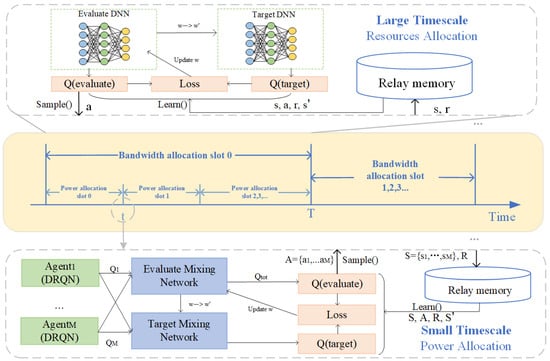 The DRM objective function minimizes two parameters of the average time, representing the performance index and the cost index, respectively. The performance index is designed to measure the degree to which the system capacity meets the demand, and it is represented by the CDG. The weight of CDG in the objective function is denoted by . On the other hand, the cost index is designed to measure the resource consumption that meets all beam demands. Assuming that VHTS uses all bandwidth resources, the selected index is the power of all beams in the satellite, where is the weight of TPC. Among them, (15)–(17) are power constraints, and (18) and (19) are bandwidth constraints. The formulated optimization problem is a nonlinear and discrete function with multiple constraints. Considering the complexity characteristics of the formulated problem, the double-timescale MADRL method is adopted to solve the formulated DRM problem.