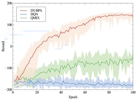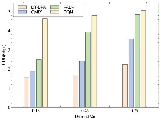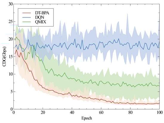 Figure 5 and Figure 6 illustrate the convergence trends of the reward and CDG of the three DRL algorithms during the training process. It can be seen that the DT-BPA algorithm and the QMIX algorithm start to converge at approximately 70 epochs, while the DQN algorithm does not converge in the end. Initially, the action is performed randomly, resulting in a smaller reward. However, as agents continue to learn and improve their actions, rewards gradually increase. The DT-BPA algorithm has a higher final convergence reward value and a smaller CDG than the QMIX algorithm, which indicates that the DT-BPA algorithm is better. The phenomenon lies in the QMIX algorithm where a single agent manages too many resources, resulting in an overly large action space. Consequently, it becomes difficult to effectively schedule resources in tandem with changing demands, usually leading to suboptimal outcomes confined within local optima.