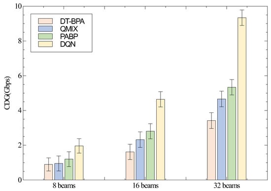 Figure 7 illustrates the CDG obtained by different resource management algorithms as the number of beams in the VHTS system changes. Input multiple sets of traffic demands with different distributions, and calculate the average and standard deviation of the obtained CDG. By comparing the proposed DT-BPA algorithm with the PABP, QMIX and DQN algorithms, it is evident that the DT-BPA algorithm achieves the smallest CDG across different numbers of beams. It indicates that the DT-BPA algorithm optimally matches the system’s capacity with the demand, ensuring an optimal utilization of resources. Since the DQN did not converge, it was equivalent to random allocation, resulting in the worst performance. When the number of system beams is relatively small, the proposed algorithm is not much different from QMIX and PBAP. However, as the number of beams increases, the superiority of the proposed DT-BPA algorithm becomes more prominent, indicating that our algorithm is suitable for the current VHTS system with a large number of beams.