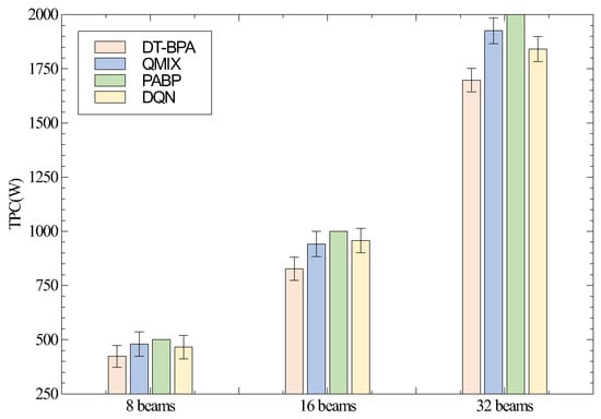 Figure 8 presents the TPC obtained by different resource management algorithms as the number of beams in the VHTS system changes. Input multiple sets of traffic demands with different distributions, and calculate the average and standard deviation of the obtained TPC. The PABP algorithm allocates all resources according to the proportion of the demands of different beams, so the TPC is fixed. By comparing the DT-BPA algorithm with the PABP, QMIX, and DQN algorithms, it can be seen that the DT-BPA algorithm consistently achieves the lowest TPC across the different numbers of beams. This indicates that the DT-BPA algorithm effectively minimizes the power consumption of the system, contributing to increased service life.