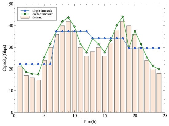 Figure 10 compares the system capacity results of double-timescale and single-timescale resource management within a day. In the case of double-timescale resource management, we adjust the bandwidth and power based on the average demand for the next six hours at 0:00, 6:00, 12:00, and 18:00. Additionally, we adjust the power every hour according to the current demand. In the case of single-timescale resource management, the bandwidth and power resources are adjusted simultaneously based on the average demand only four times to satisfy the traffic demand for the whole day as much as possible. It is evident that, despite significant fluctuations in traffic demand over time, the double-timescale resource management algorithm still achieves the satisfactory matching of capacity and demand. It demonstrates the effectiveness of managing both bandwidth and power resources on different timescales.