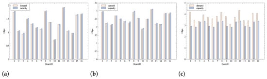 Demands and capacities of 16 beams based on the DT-BPA algorithm under different total demand. (a) 21 Gbps at the 0:00; (b) 40 Gbps at the 19:00. (c) 60 Gbps.