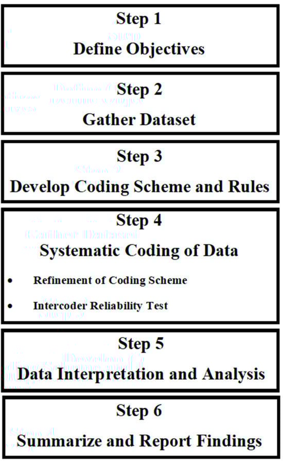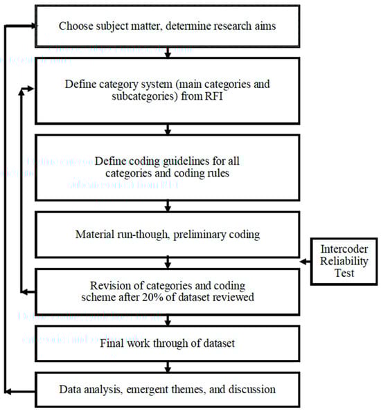 Content analysis is a methodological approach associated with the study of inscription contained in varying forms of documentation, such as newspapers, journal articles, and other types of written records []. It is a mixed-method analysis that combines qualitative steps (grouping and assignment of text segments to categories) and quantitative steps (analyzing the frequency of concepts and terms) []. By systematically analyzing textual material (the comments), we identified the presence and frequency of certain concepts and themes. As a method that allows researchers “to make valid inferences from text” [] (p. 9), we used this approach to answer our research questions, including how to define and mitigate catastrophic cyber incidents, whether the cyber insurance sector has the capacity to address these incidents adequately, and if the federal government should step in. Figure 1 provides a step-by-step view of conducting content analysis.
