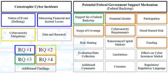 In addition to the categories derived from the RFI questions, we also added two categories to code for concerns and regulations. The “concern” category was created to capture any mention of concern or worry about federal government intervention that was conveyed in the comments. The “regulation” category was used to capture any discussion including regulatory language or support of regulation such as the implementation of a federal backstop to improve the capacity of the cyber insurance sector. In total, we outlined 19 different categories to capture opinions conveyed in the comments. Figure 3 shows the 19 distinct categories in this content analysis and indicates which categories we used to answer each research question.