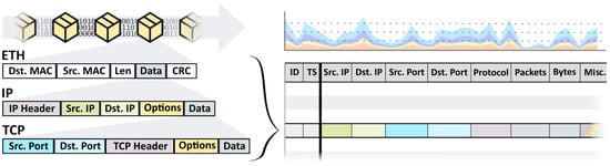 Flow-based data, on the other hand, represent aggregated packet data [29]. The prevalent aggregation criterion typically involves a set of five features: source IP address, source port, destination IP address, destination port, and protocol (Figure 1). Both unidirectional and bidirectional flows are distinguished [30]. In addition to the mentioned attributes, flow-based data include statistics such as communication duration, the number of bytes sent per second, time intervals between sent messages, and the size and number of transmitted packets [1]. Common flow-based formats include NetFlow [31], IPFIX [32], sFlow [33], and OpenFlow [34]. The more sophisticated yet flexible definition of network flow is used by FLDX, a nationwide cybersecurity system managed by the NASK National Research Institute [29]. Furthermore, other data formats exist, such as flow-based datasets enriched with additional information from packet-based data or host-based log files [30].