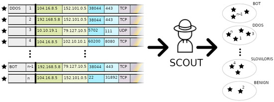 - Facilitation of automatic signature generation: Once flows representing distinct attack types are clustered, SCOUT can serve as the initial step for automatic signature generation. Thus, it could enable the creation of precise attack signatures, leading to the early detection of novel threats that traditional methods might miss;
