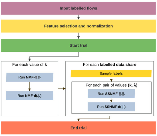 Tropp demonstrated that many clustering algorithms can be expressed as matrix factorization problems with constraints [19]. Non-negative matrix factorization (NMF) stands out as a prominent clustering method [20,21], with Udell extending NMF to handle arbitrary datasets [9]. Semi-supervised learning algorithms have gained popularity [10,22,23,24,25], operating on partially labeled data. Semi-supervised Non-negative matrix factorization (SSNMF), introduced by Lee et al. [24] and extended by Haddock et al. [23], has been examined for clustering malicious network traffic [26].